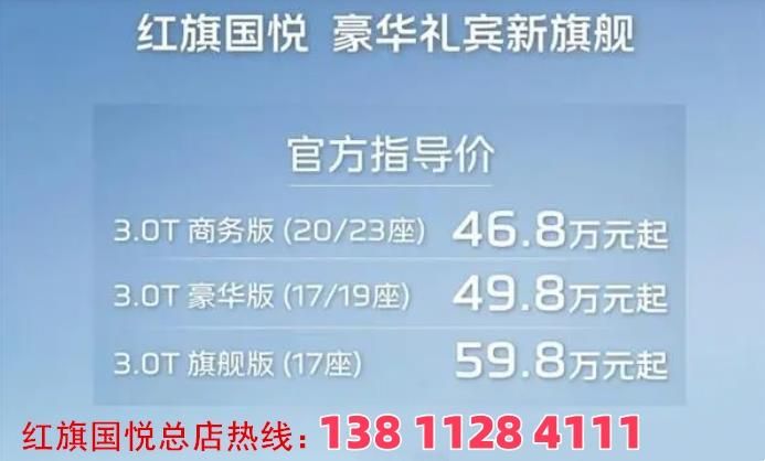 商务版(20 座、23 座)、豪华版(17 座、19 座)、旗舰版(17 座)三款配置,动力系统则搭载了红旗自主研发 3.0T V6 机械增压发动机 + 采埃孚 8AT 变速箱。红旗国悦4S店 【亚洲最大红旗国悦专营中心】: 同微信 魏总门店地址:北京市顺义区火寺路88号主营车型:红旗国悦6座、7座、9座商务车,10座12座现车销售,私人定制,全国上牌,分期贷款北京红旗国悦厂商 北京红旗国悦4s店电话 (总店) 魏总 同微信
